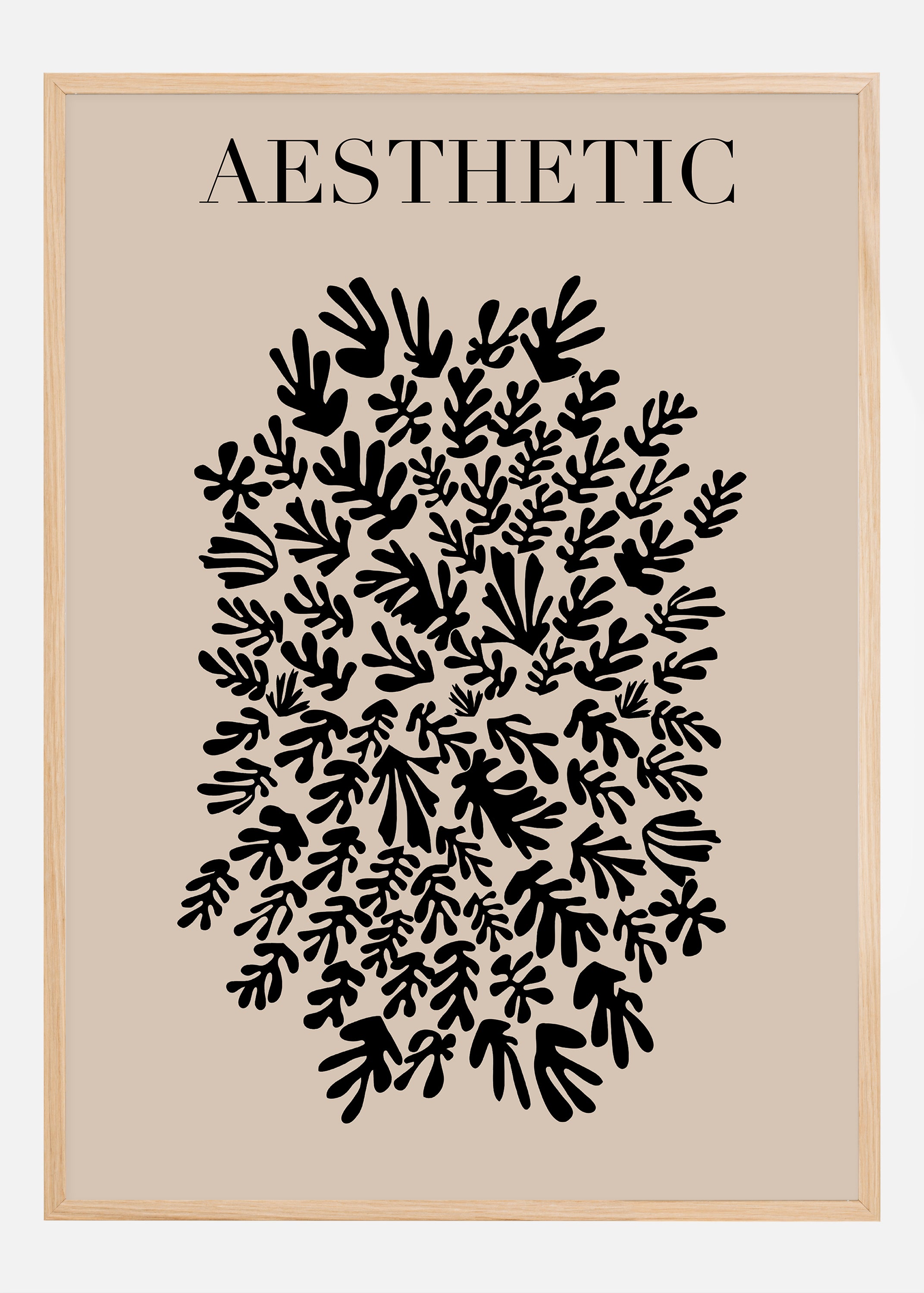 With its modern expression and simple color palette, limited to black and beige, this print provides a calming and balanced impression. The word "AESTHETIC" placed at the top of the motif serves as a powerful reminder of the eternal beauty of design and nature. This poster would be excellent in an interior where you wish to create an oasis of tranquility and inspiration, or as part of a larger gallery wall to create a cohesive visual experience.