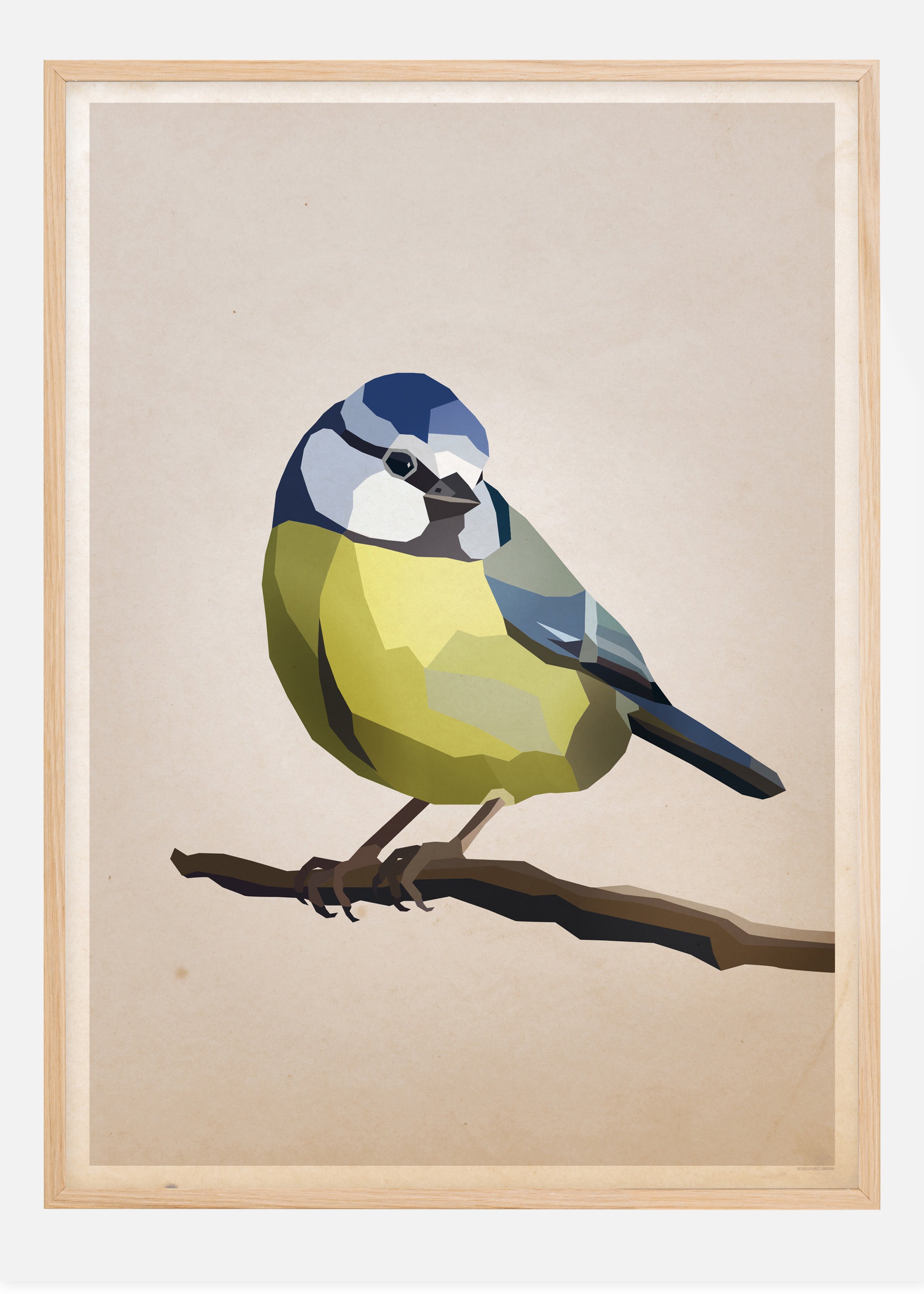 An ornithological poster of a small, plump blue tit. This delightful image is an abstract print of this cute British bird. The blue tit sits on a single branch against a grey background. For a cute look, match the yellow and blue with softer tones on your wall.