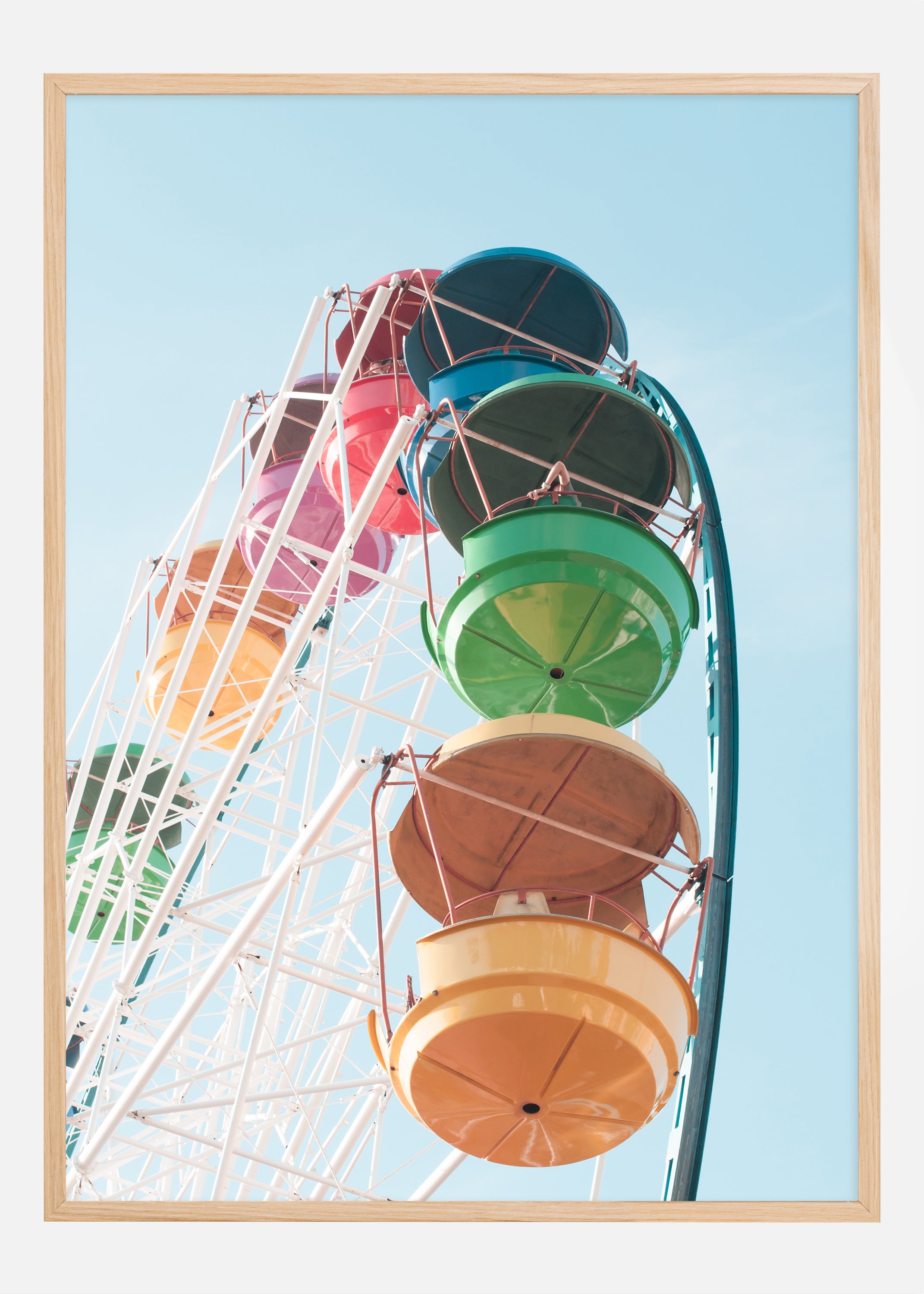 Our range of posters presents here a detailed depiction of a ferris wheel, whose gondolas shimmer in shades of pink, red, blue, green, orange, and yellow. The colors are vibrant and expressive, contrasted against an elegant white structure and the minimalist beauty of the open sky. Perfect for creating visual interest in any room, and this print is guaranteed to be a conversation piece among your guests.