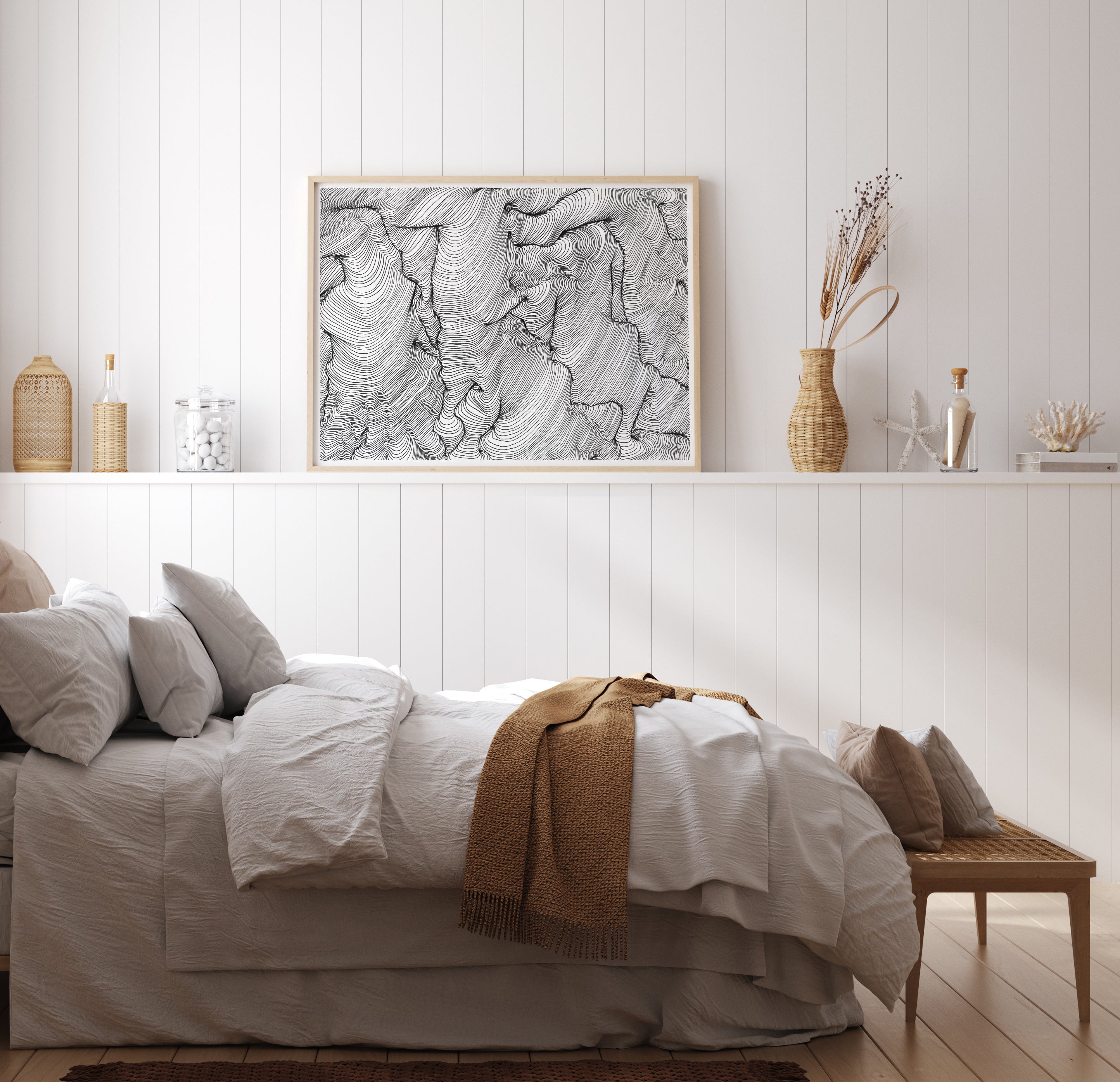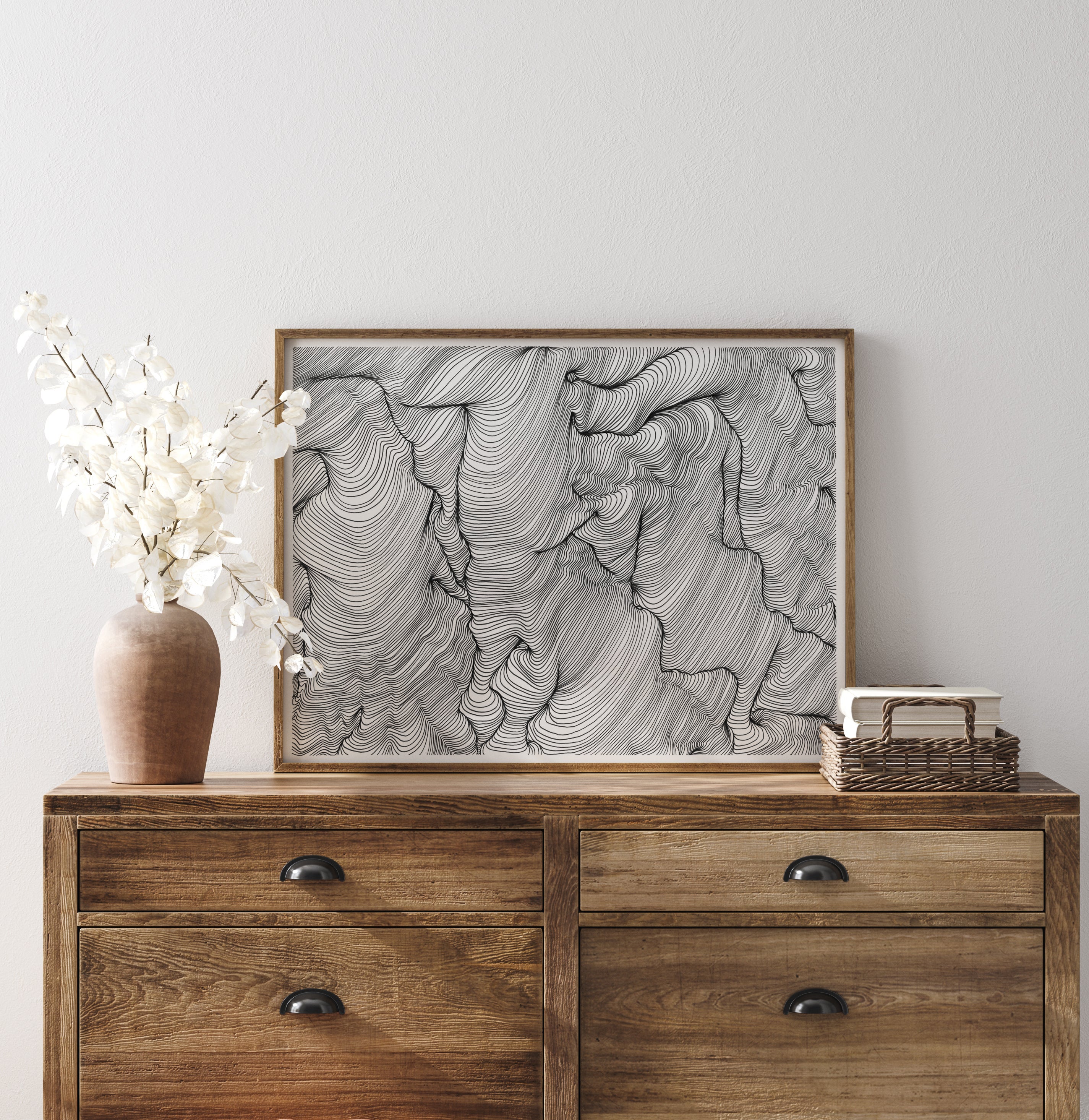 An abstract art poster in black ink with undulating lines that create exciting shapes, created by Belinda Hellberg, Hells Bells Sthlm. The motif is surrounded by a slightly thinner white mount that effectively highlights its content. A simple and stylish poster that is easy to combine with other favourites on a larger picture wall.
