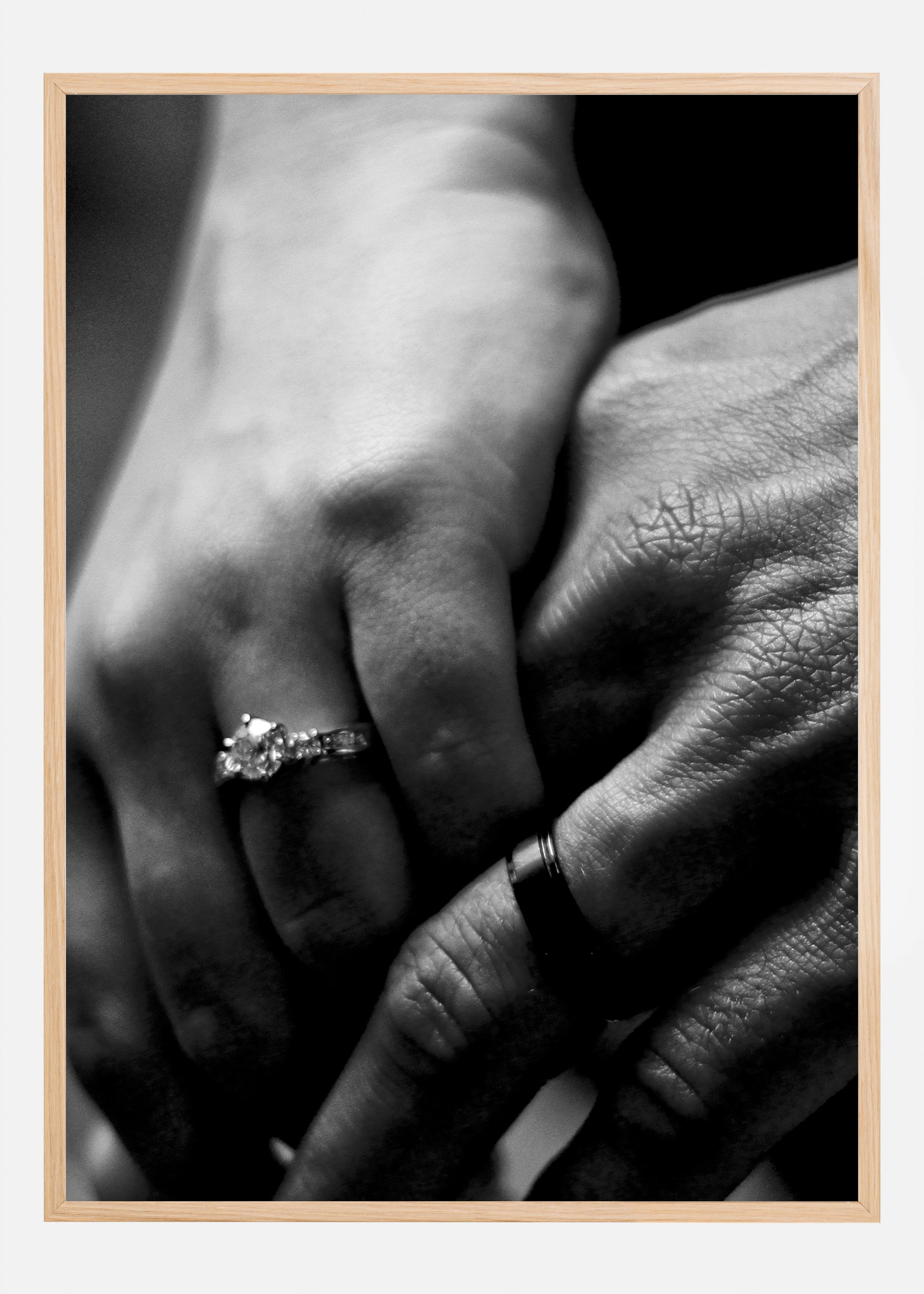 A romantic black and white print of two hands wearing rings. A strong and emotional picture set on a dark background. The natural light shines onto the small diamond like ring. A romantic picture to hang on a bedroom wall.