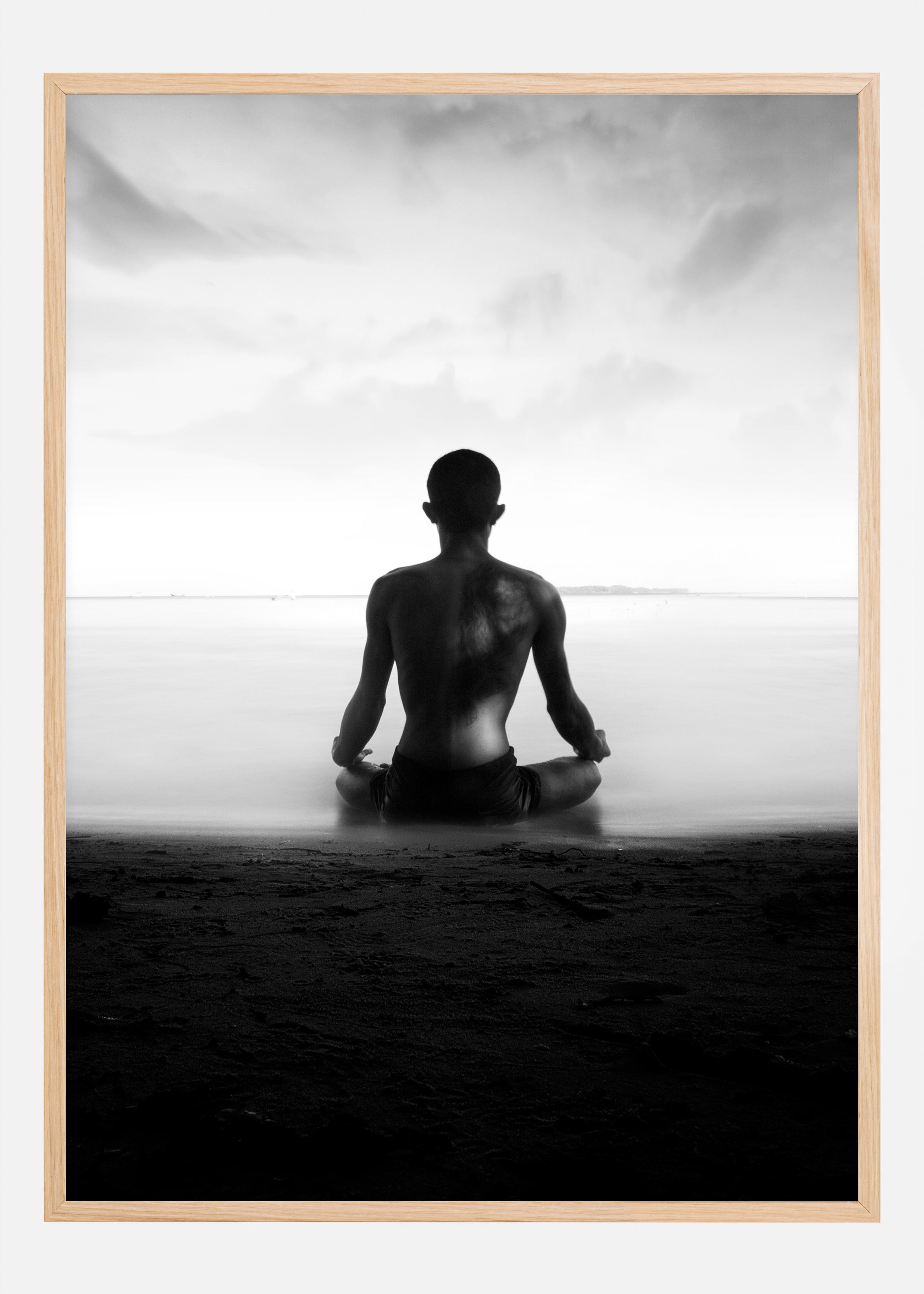 A beautiful black and white print of a figure looking out to the horizon. Sitting in a yoga pose this is an ideal print for those looking for a zen reminder in their home. It is also perfect for a yoga studio to create a calm and relaxing atmosphere.