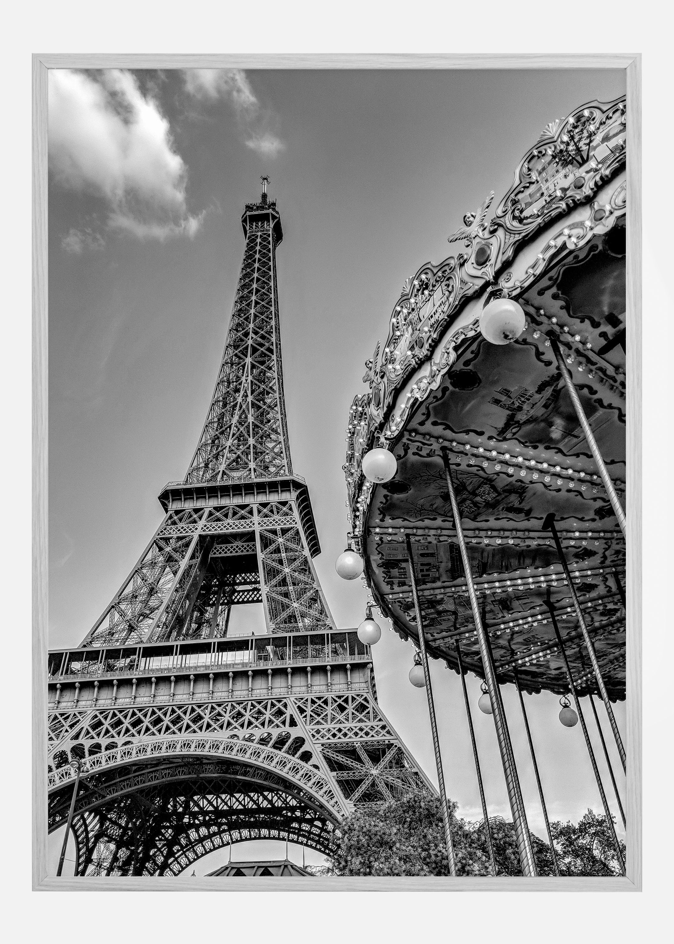 Relive the romance and charm of Paris with this classic black and white poster. The image captures the iconic Eiffel Tower in the background, with the graceful lines of a carousel in the foreground. The timeless architecture playfully contrasts with the nostalgic carousel, creating an enchanting composition that evokes thoughts of calm walks along the Seine and wonderful moments in the heart of the city.
