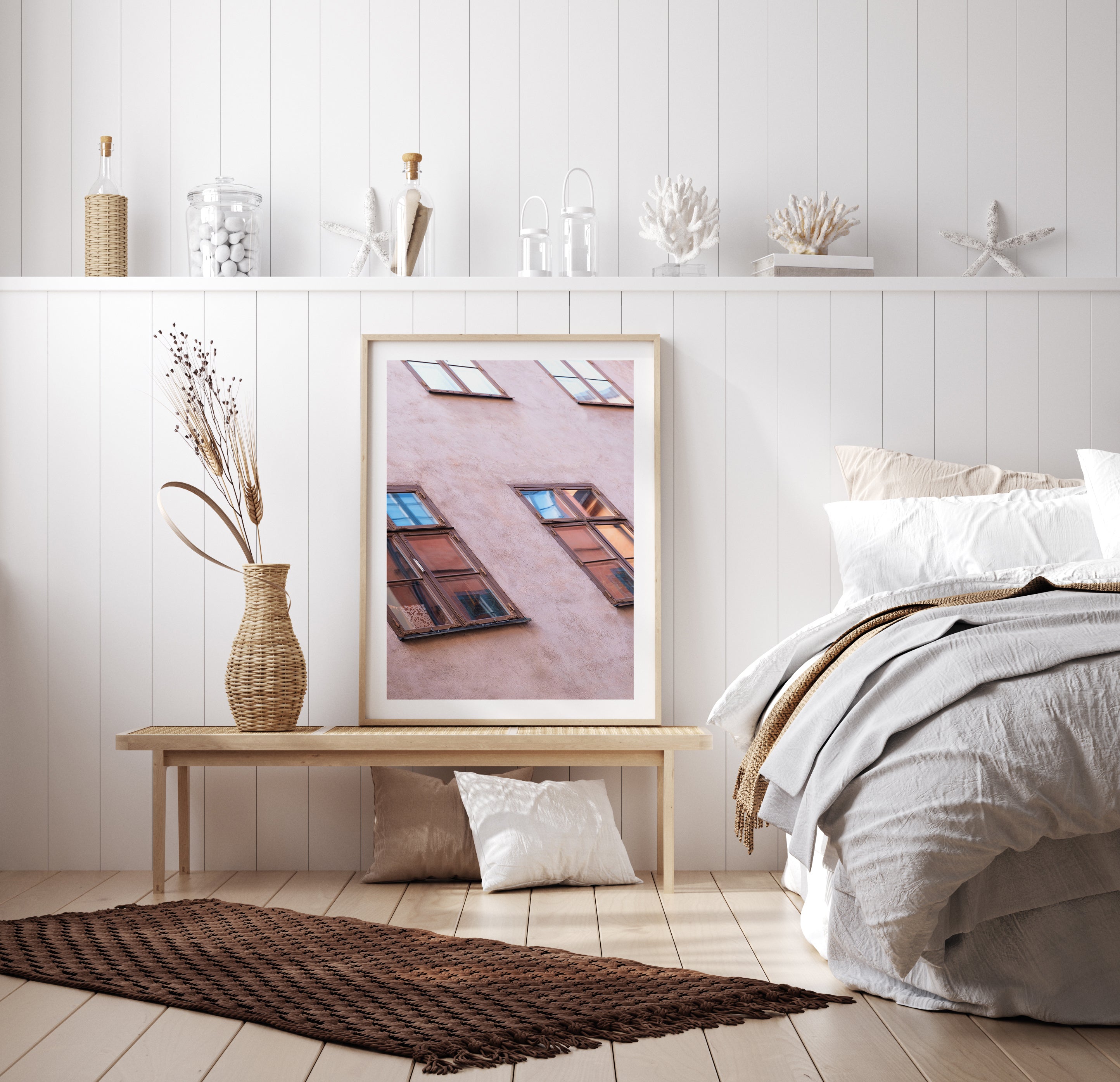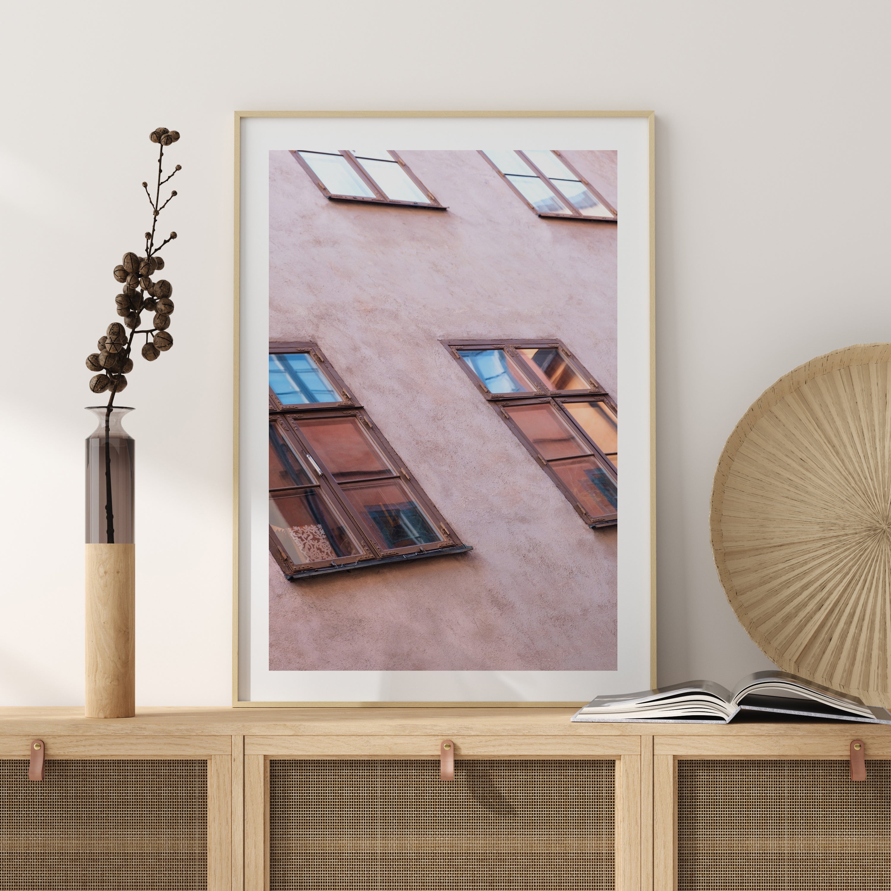 A photographic poster of a facade in contrasting shades of brown and pink. A simple and pleasant motif that is framed by a slightly wider white mount. Suits most homes and interior styles.