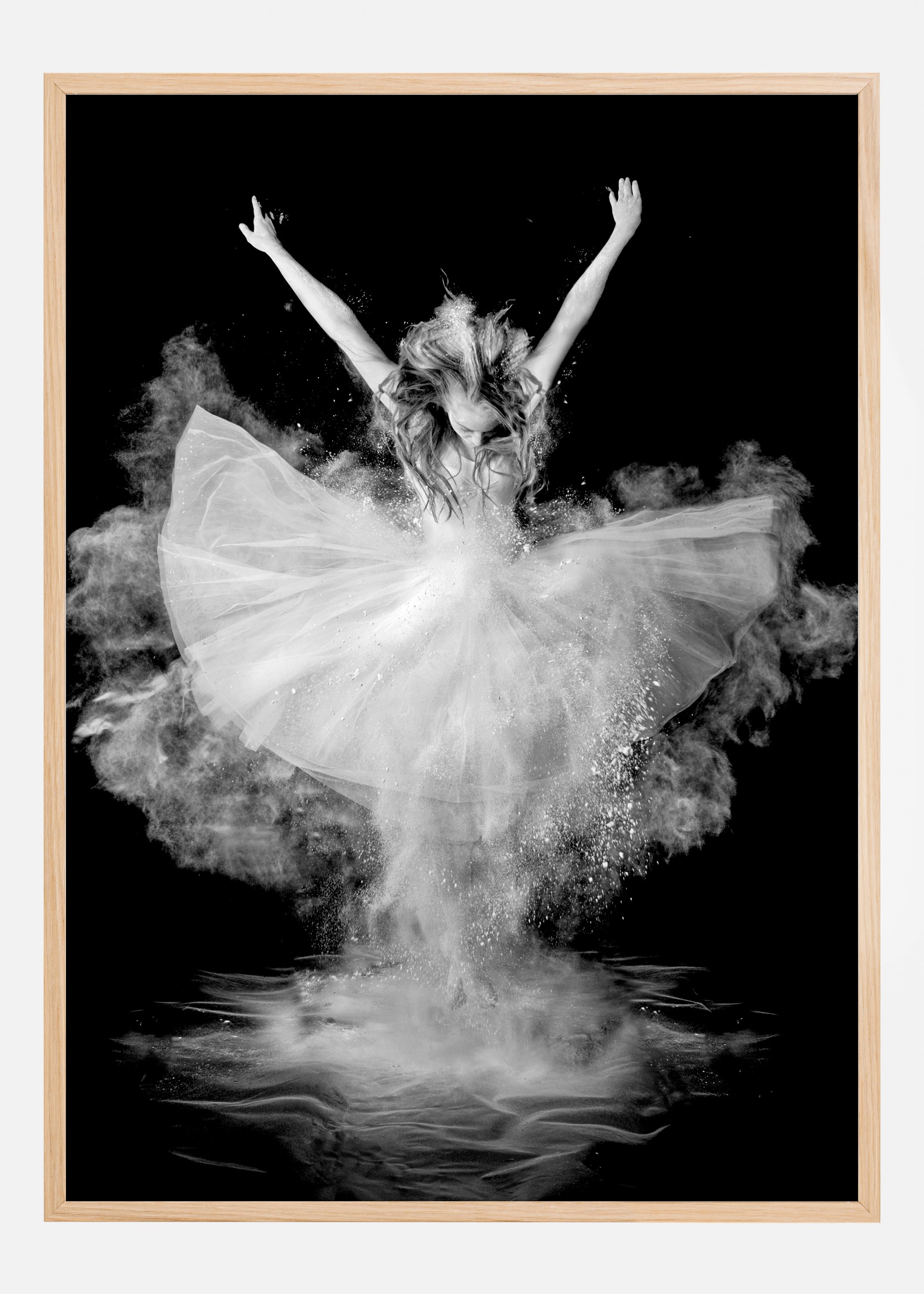 A magnificent black and white picture of a dancer. Set on a black background, the dancer seems to be performing on water. With her white ballet dress spread open, white dust falls from the dress and reflects beautifully in the water. A magnificent print to hang in your home.