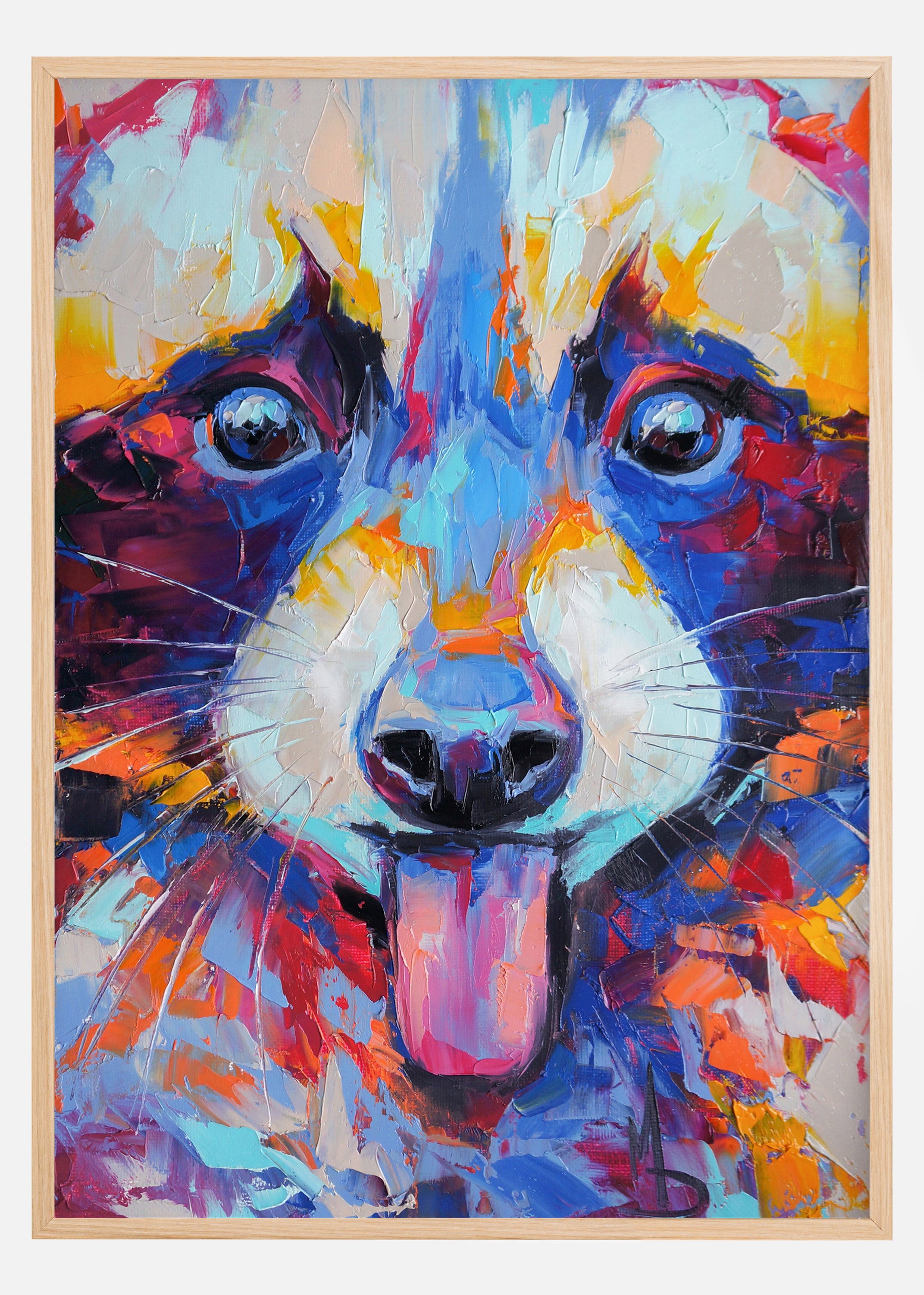 A multi-coloured portrait of a Shiba Inu dog. The well-blended colours give a perfect view of its sky-blue eyes, dark nose, pink tongue, and black and white whiskers. The zoomed art with the artist's signature at the bottom-left is best for a pet lovers' living room or bedroom.
