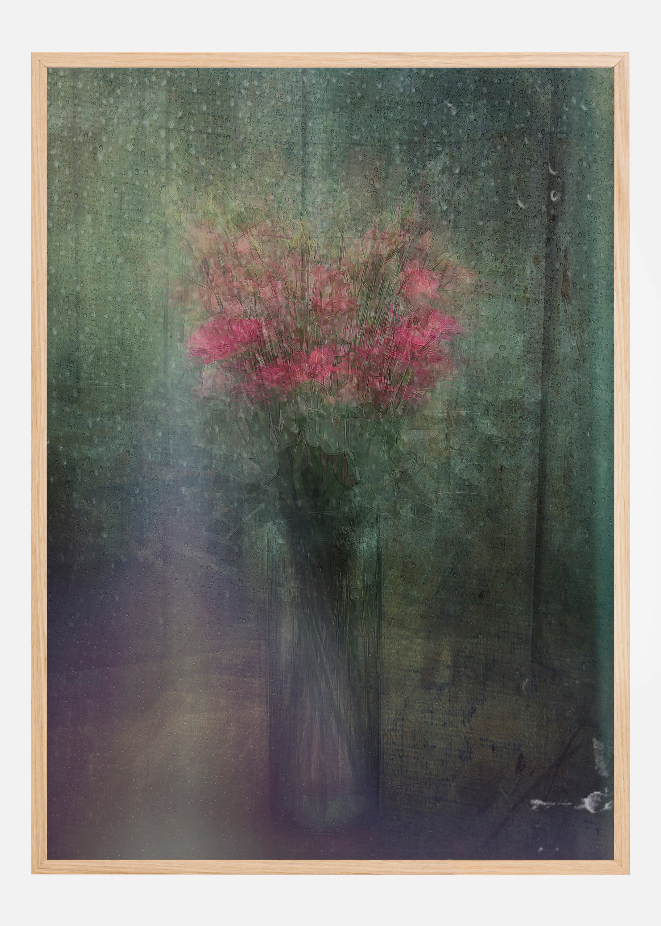 An amazing poster of a pink bouquet of flowers on a rainy day. Set on a green backdrop, the transparent flower vase stands on a light mauve coloured surface. The natural light beams onto the flower stems. An idea print for a living room wall.