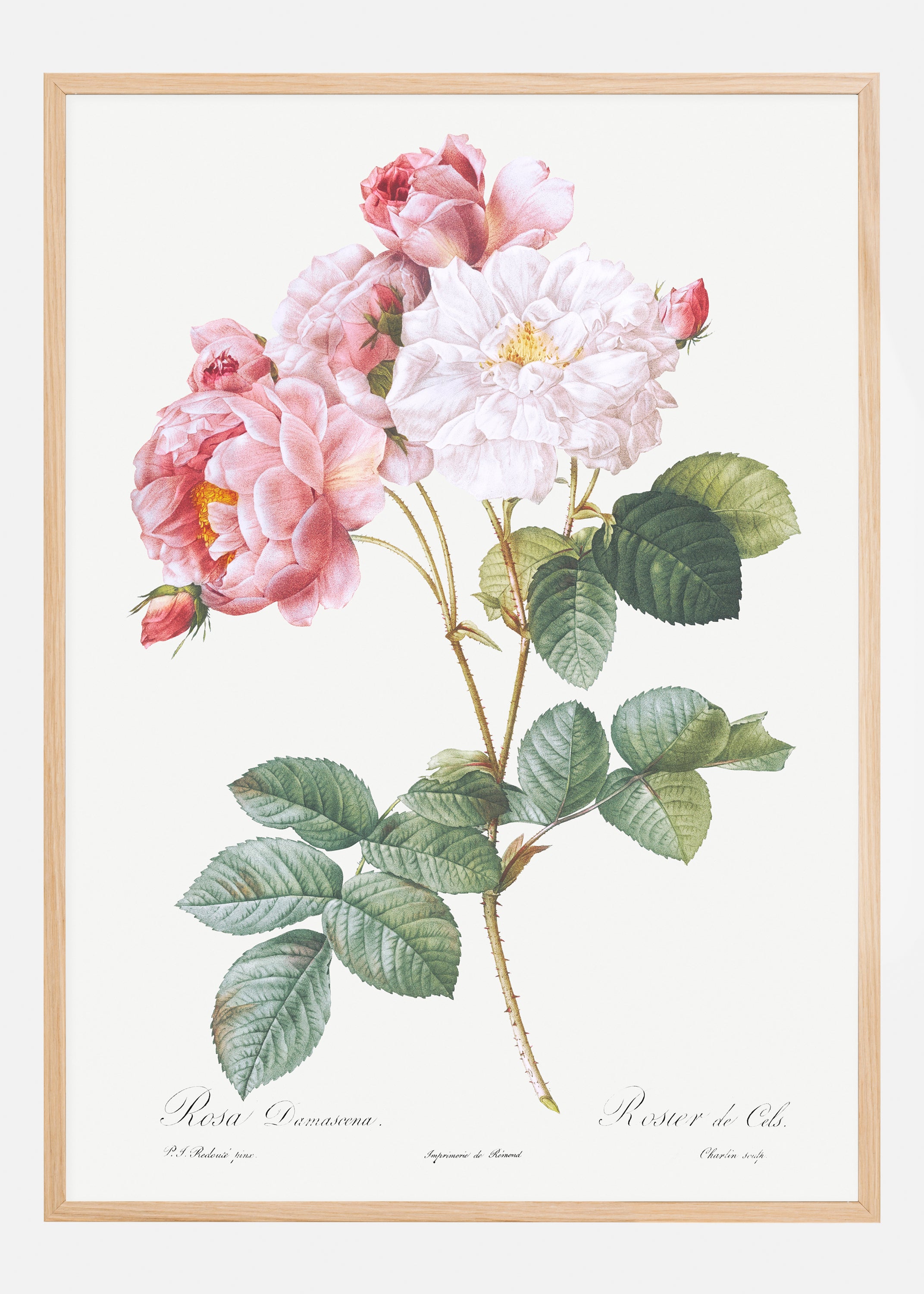 An illustrative poster of pink and white Rosa damascena. The watercolour painting has been done in incredible detail so you can enjoy all the petals and veins in the flowers and leaves. Add this to your wall for a botanical vibe.