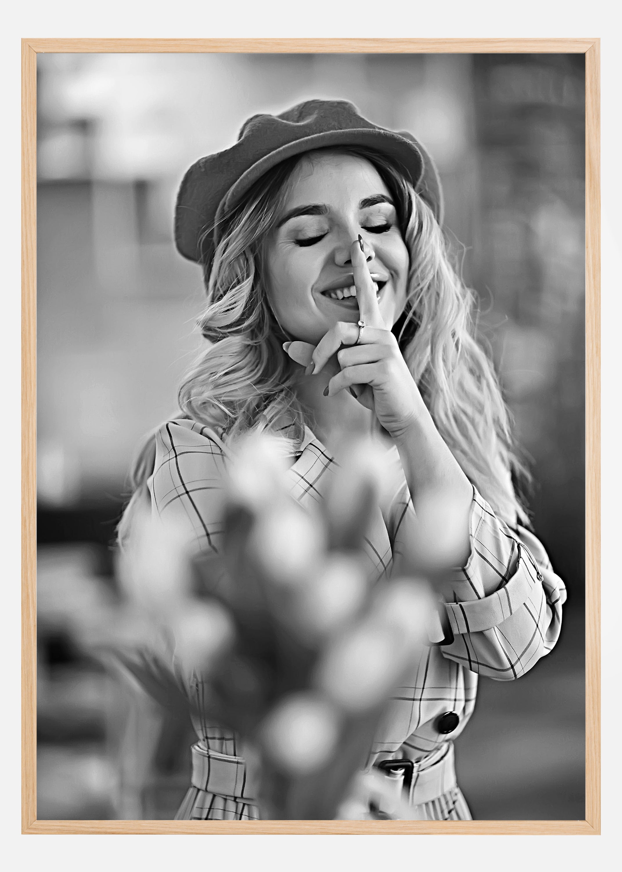 A cheeky portrait poster of a girl with her finger to her lips. Blonde hair cascading down from under her hat, this cute girl grins broadly as she raises a quietening finger to her lips. This black and white piece will raise your spirits every day when you take this in as you wake up.