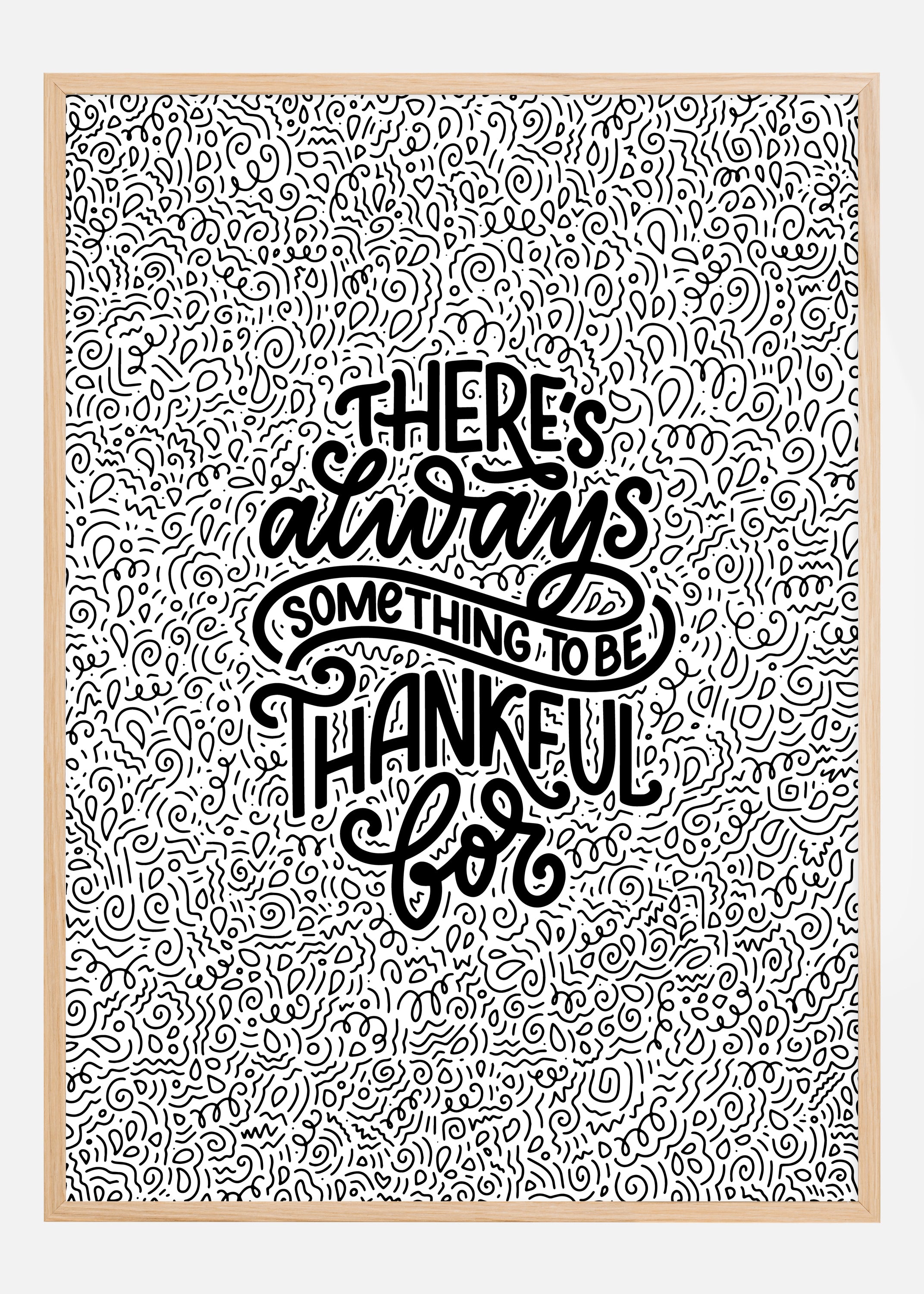 This stylish and inspiring poster is a tribute to the power of gratitude in our daily lives. The neatly handwritten text "There's always something to be thankful for" is framed by a sea of detailed, swirling patterns that fill the background, creating a dynamic and captivating contrast. Black and white in the color scheme, this print is a timeless asset to any room and a reminder that there are always reasons to feel grateful.