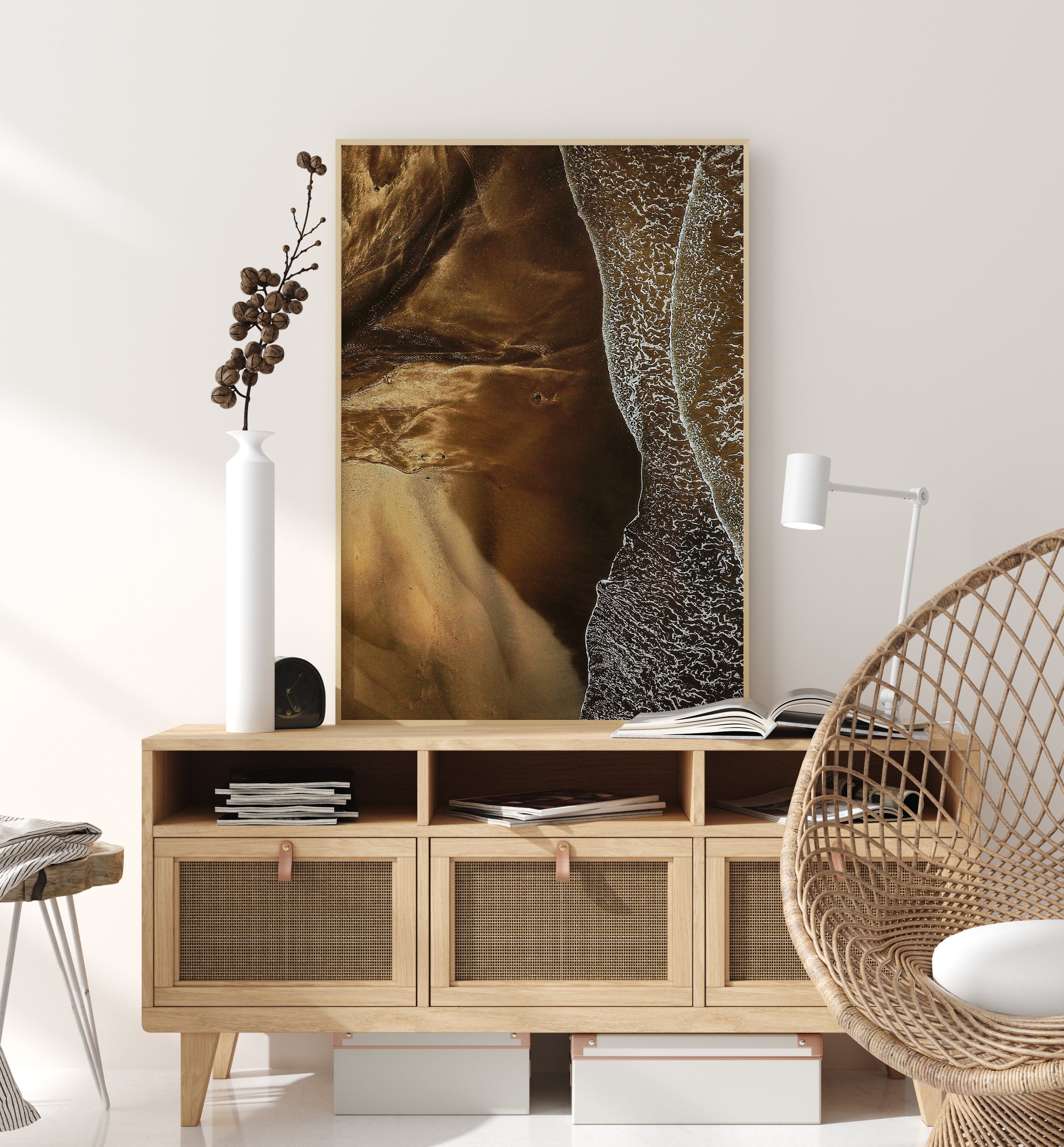An aerial color poster of a beach and the waves. The dark browns of the beach help the white frothy surf stand clear. Immerse yourself in nature with this stunning view of the world.