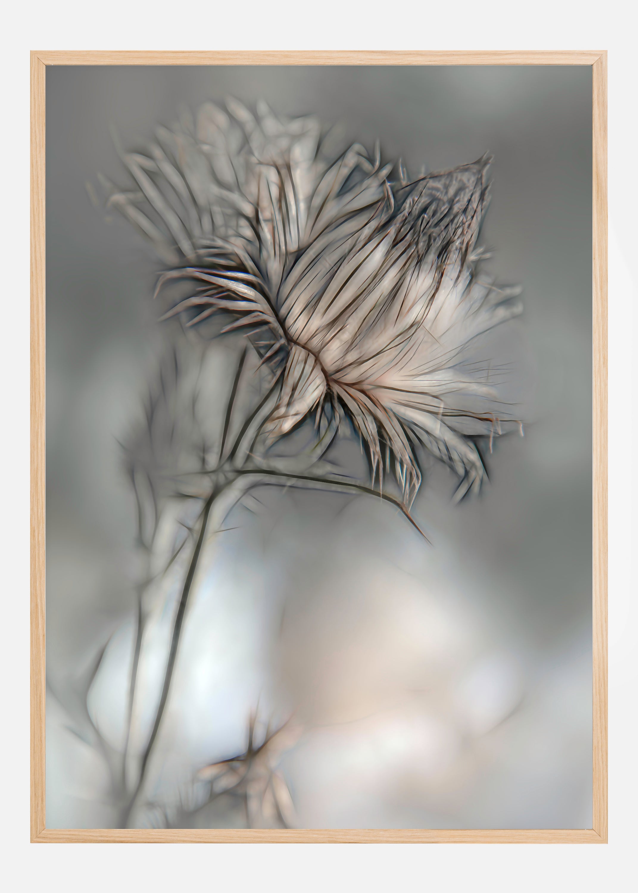 A close-up poster of a flower head. Soft blues, greys and pinks fill this image as the flower is sharply defined against the softly blurred background. You can almost reach out and pluck the flower from this stunning, soft image.