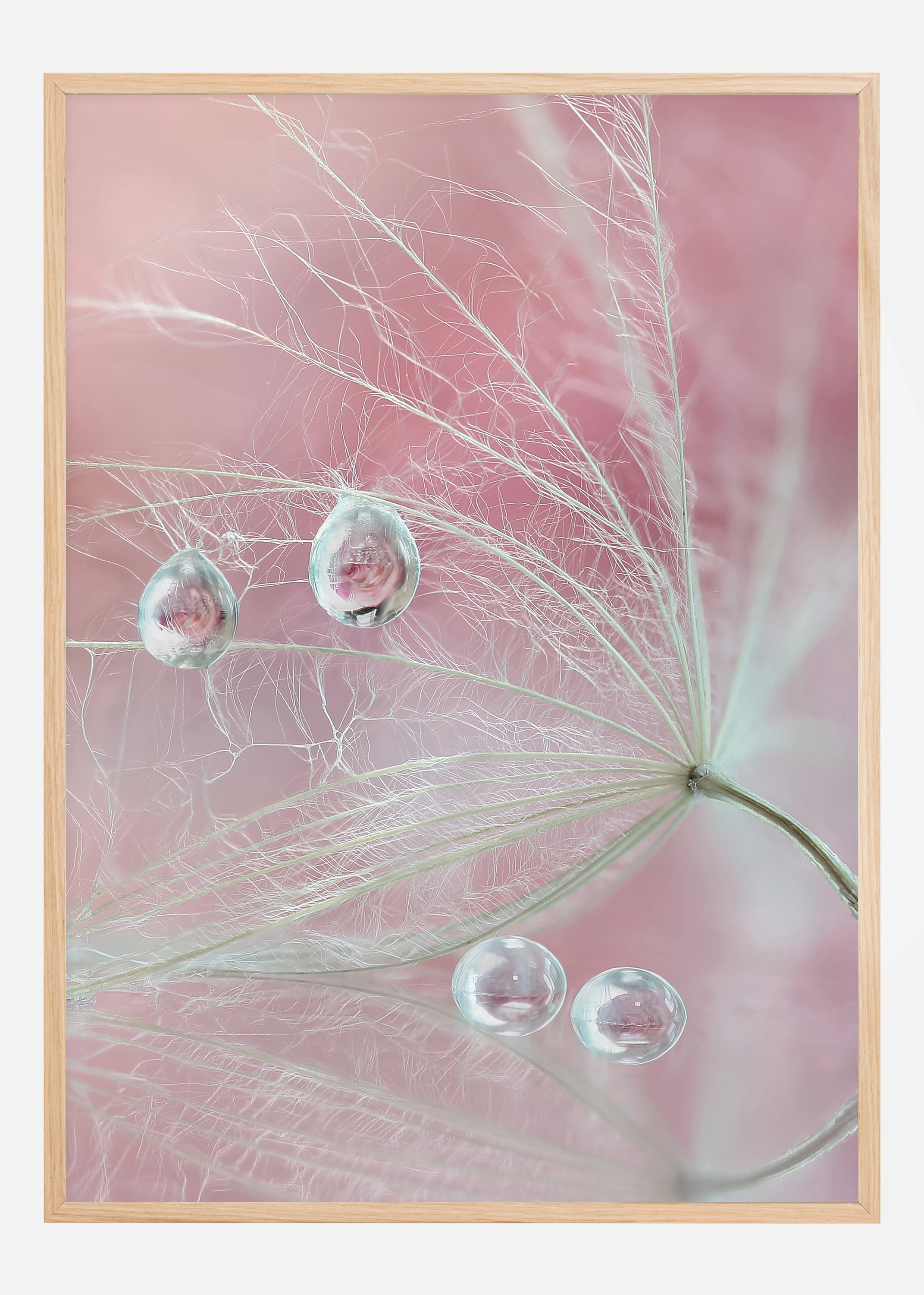 An elegant poster of a spidery flower head, two droplets of water beading the fragile feathery ends. A bright pink background glows through each of the perfect water droplets as they hang right before they drop off the flower. Enjoy the delicate balance of nature.