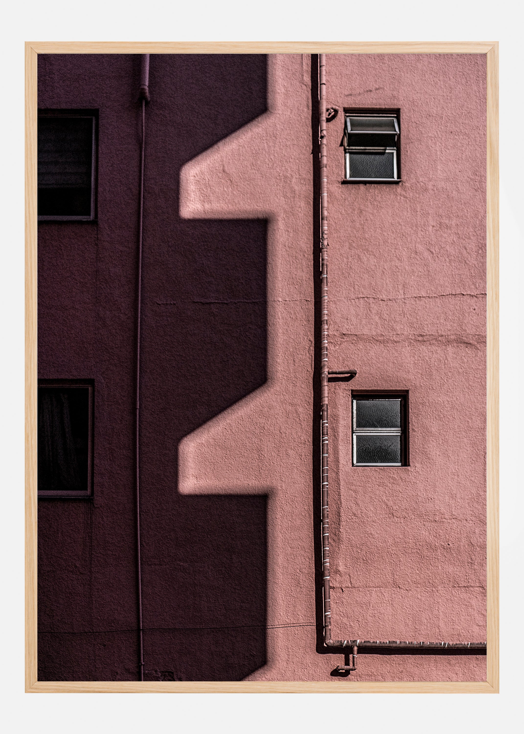 A building poster of the exterior of a dark pink building. Shadows and light cast strange shapes on the side of the building. The windows appear like eyes, lining up with the shadows that look like noses, so this image seems to be staring right back at you.