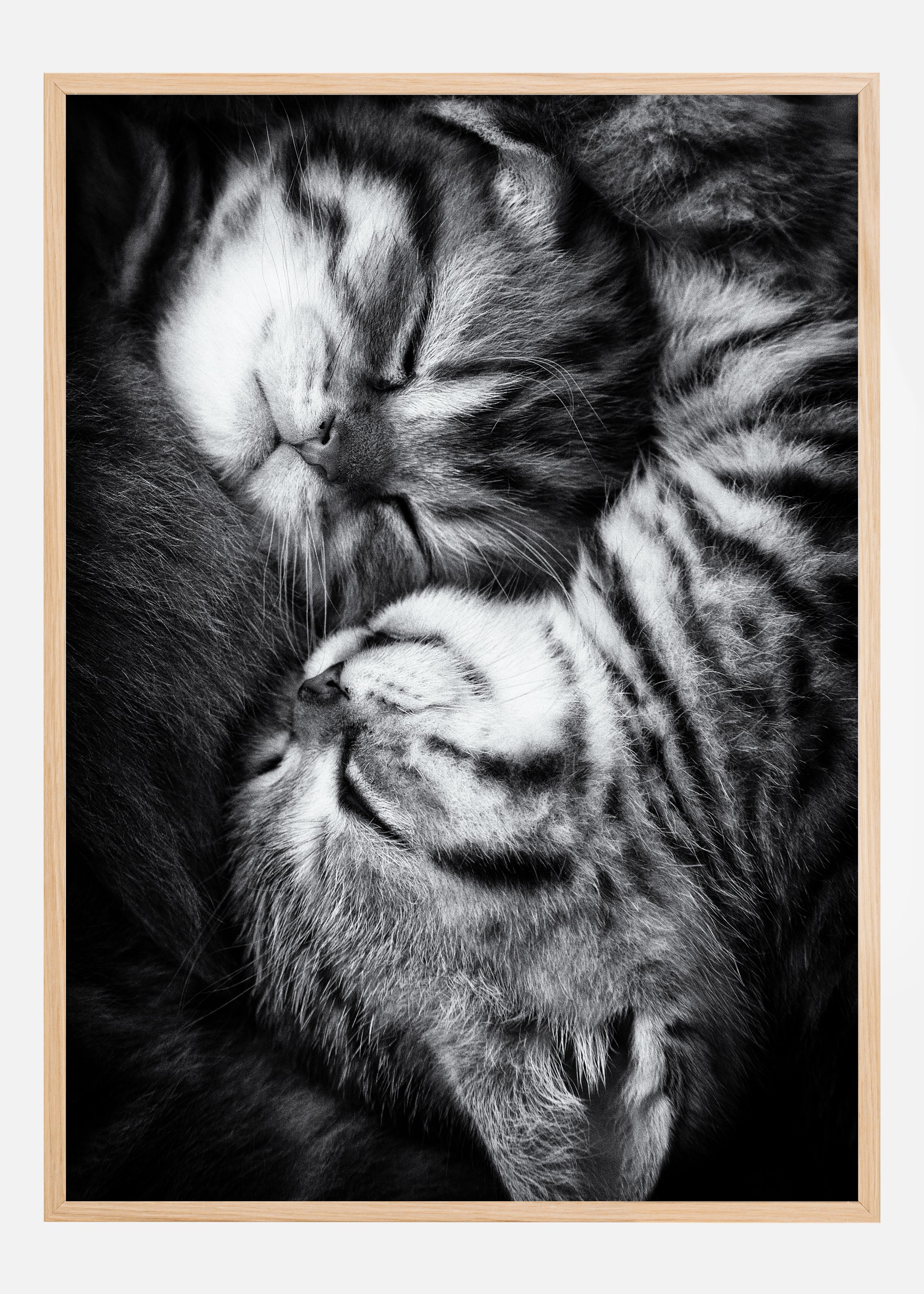 A cute animal poster of two kittens entwined asleep. Bring this print home and enjoy the feel of a hug whenever you look at these adorable cats cuddled up together.